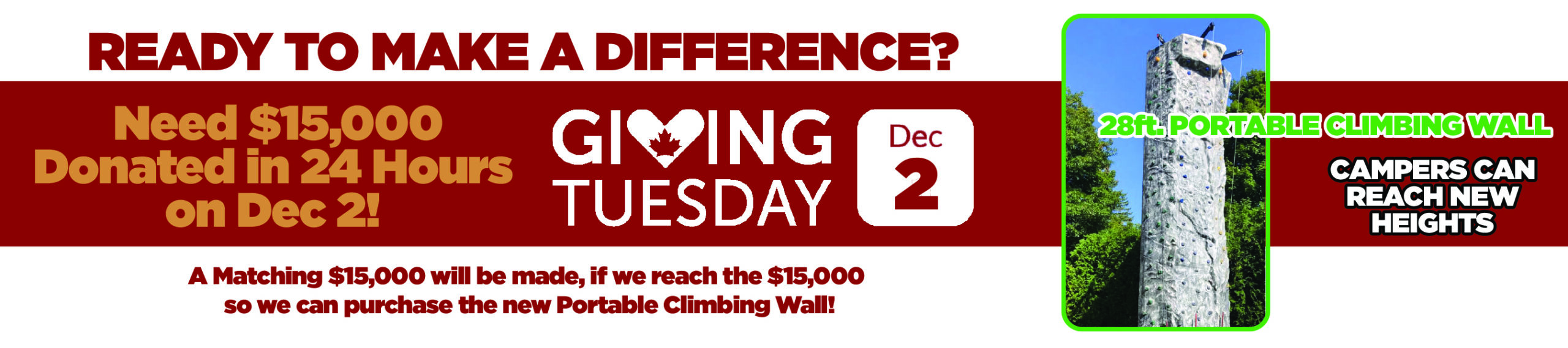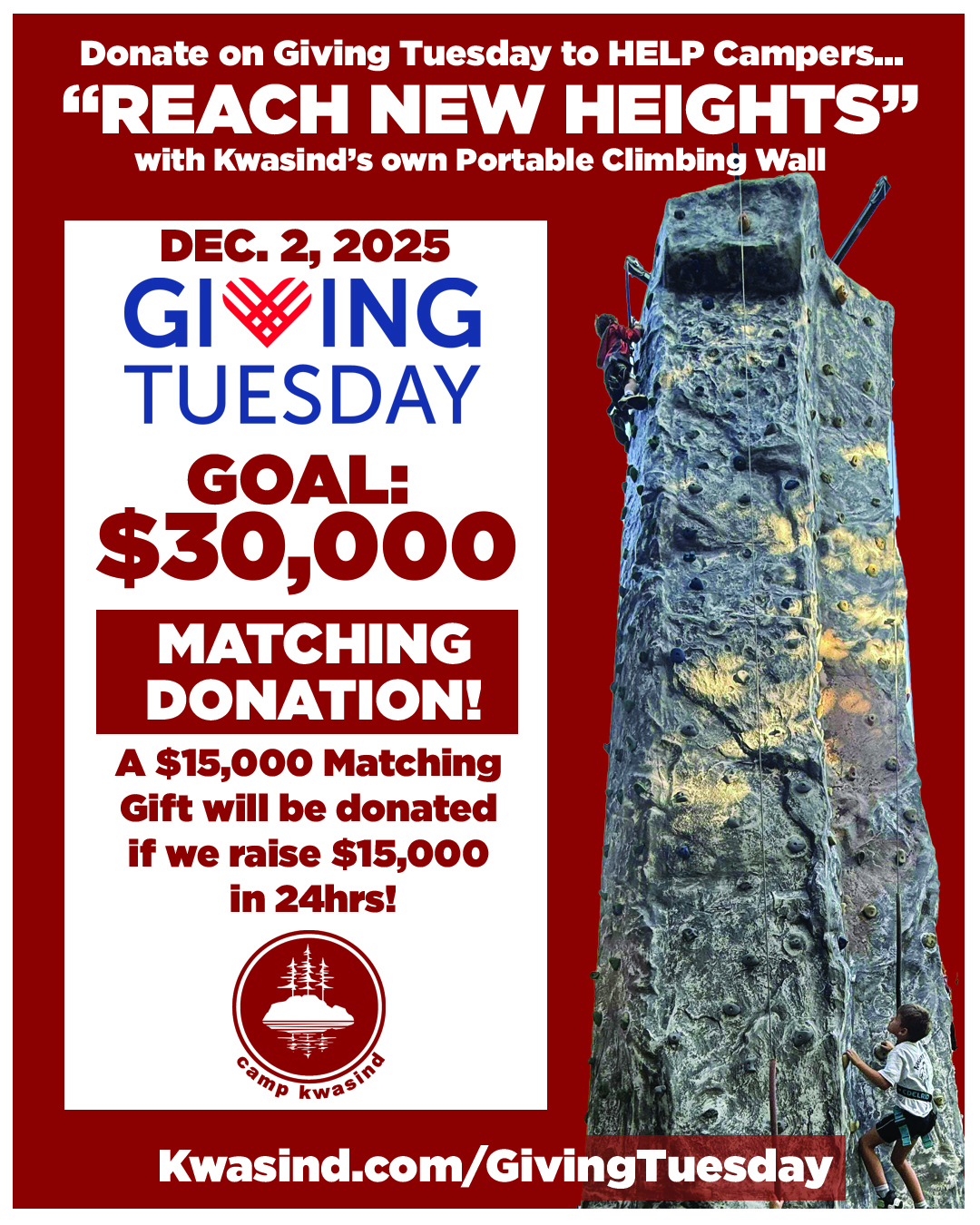 For every dollar that is donated to “REACH NEW HEIGHTS” on Giving Tuesday, it will be matched up to $15,000. By donating to Camp Kwasind on Giving Tuesday, it will have double the impact as it will be MATCHED by a donor. With our goal of $30,000 to be able to purchase the Climbing Wall, through this MATCHING DONATION, we now only need to raise $15,000 in 24 Hours on Dec 2, 2025.